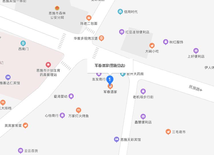恩施花江狗肉總店地址:恩施市計生服務中心,民族路與大橋路交叉十字路口向移動公司下行20米左右(步行街進口處)恩施市軍春酒家花江狗肉蝦蟹王