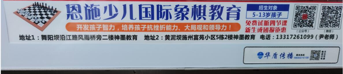 恩施少兒象棋教育地址1:舞陽(yáng)壩沿江路風(fēng)雨橋旁二樓神墨教育??地址2:黃泥壩施州富苑小區(qū)5樓2樓神墨教育