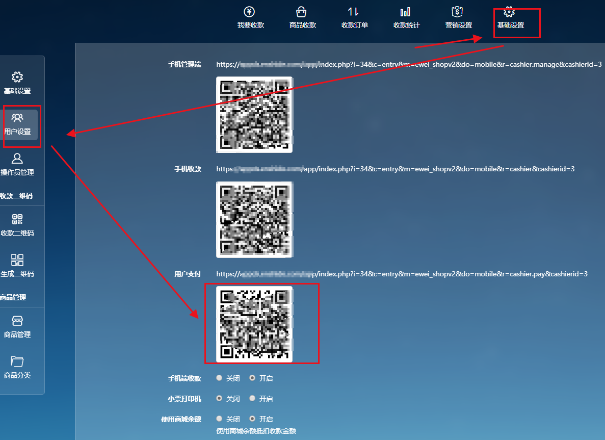 人人商城收銀臺(tái)中的 ---> 基礎(chǔ)設(shè)置 -----> 用戶設(shè)置中的 -------> 用戶掃碼支付 也不支持支付寶