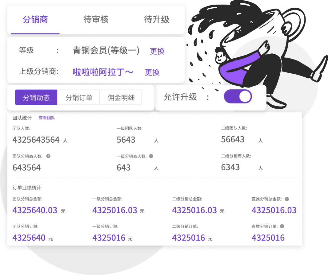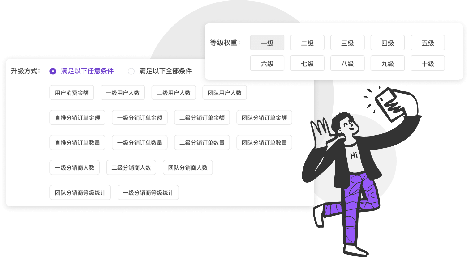 含市面通用的升級制度,可根據(jù)團隊、 金額、單量信息結(jié)合一級、二級、 團隊架構(gòu)靈活配置升級制度