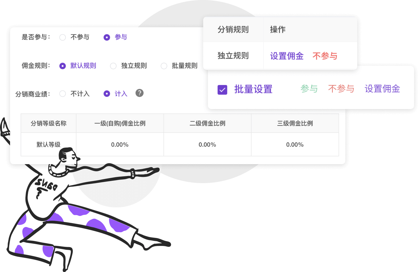 可具體到規(guī)格分配傭金百分比或金額, 重新設置分銷層級、結(jié)算條件, 滿足全品類商家的靈活傭金制度。