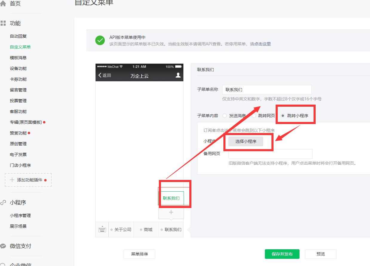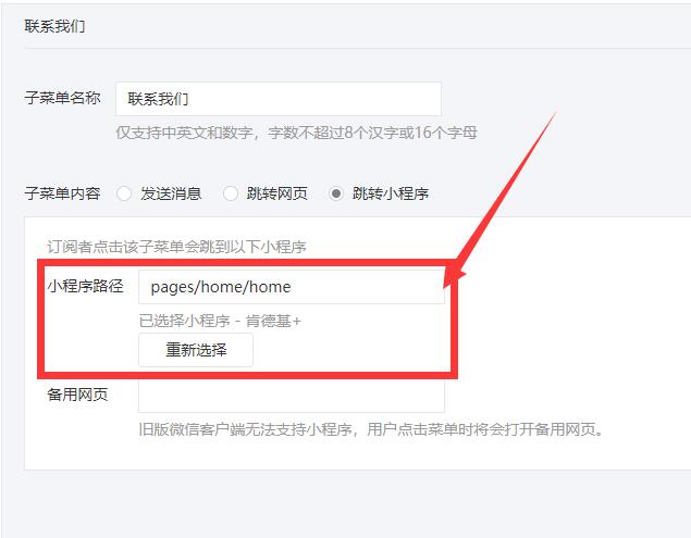 2.綁定成功后,再去我們微信的自定義菜單,任意建一個菜單,選擇跳轉(zhuǎn)至微信小程序,然后默認路徑就會自動出來了