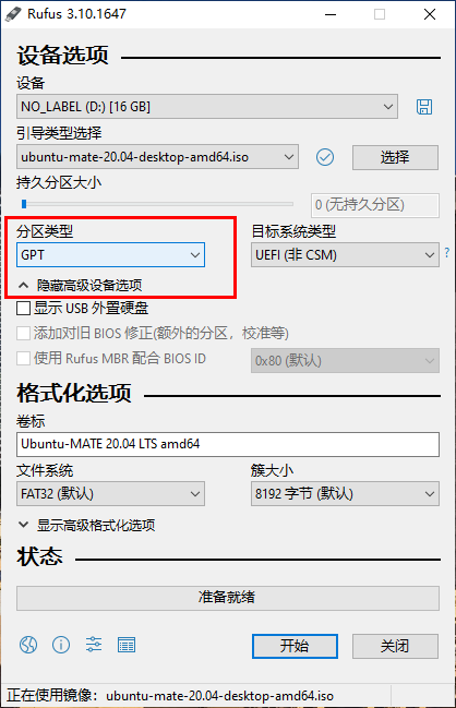 接下來我們在電腦上下載鏡像刷寫工具 Rufus,然后插入 U 盤,在「設(shè)備」中選擇你剛剛插入的 U 盤,在「引導(dǎo)類型選擇」中選擇你剛剛下載的 Linux 系統(tǒng)鏡像。需要說明的是,在分區(qū)類型中一定要選擇「GPT」分區(qū),目標(biāo)系統(tǒng)類型必須是「UEFI(非 CSM)」,準(zhǔn)備好之后選擇開始。