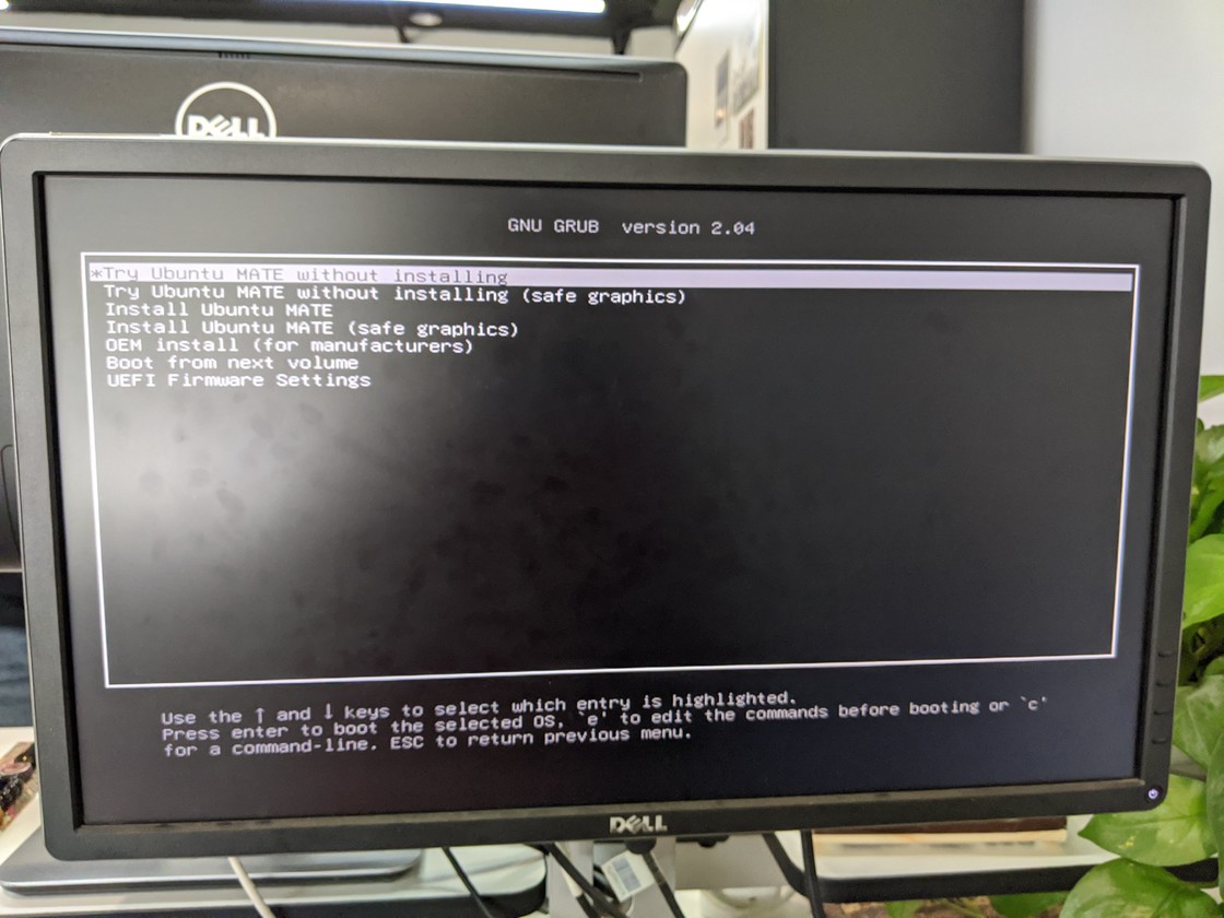 設(shè)備重啟后,在 GNU GRUB 中選擇第一項(xiàng)目(Try Ubuntu MATE without installing)然后回車進(jìn)入 Ubuntu MATE Live USB 中。