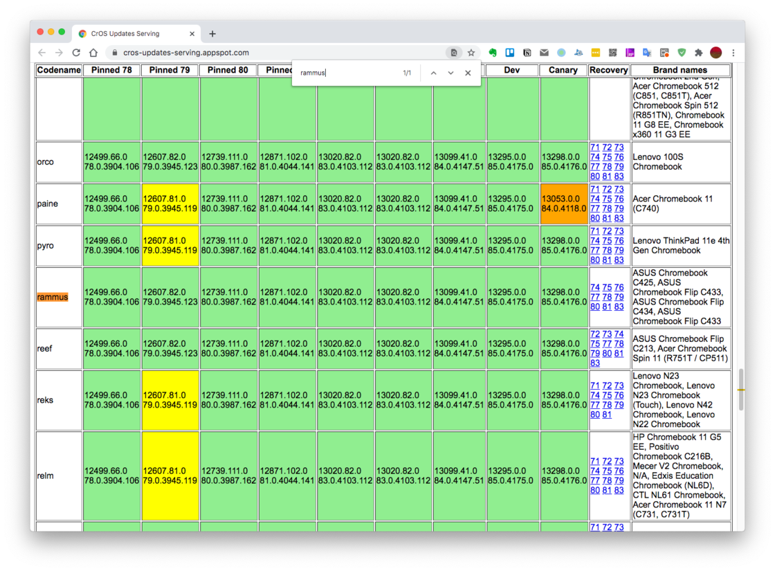 下面我們準(zhǔn)備 Google 官方的 Chrome OS 恢復(fù)鏡像,打開這個 離線鏡像搜集網(wǎng)站,然后使用快捷鍵 CTRL + F 搜索關(guān)鍵字「rammus」,然后在對應(yīng)的表格行的「Recovery」中點(diǎn)擊「83」下載恢復(fù)鏡像。