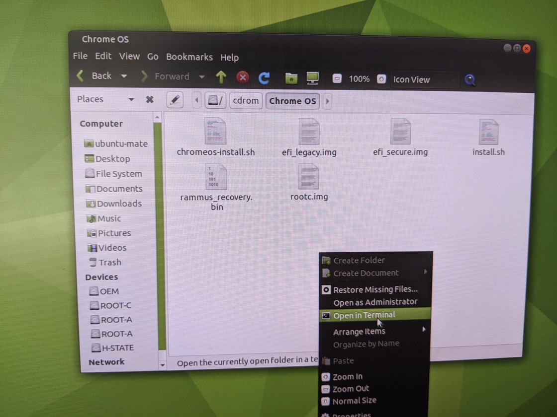 然后雙擊打開桌面上的文件管理器,點(diǎn)擊左側(cè)的File system,然后導(dǎo)航至/cdrom/Chrome OS,在當(dāng)前目錄下,右鍵點(diǎn)擊選擇Open in Terminal。