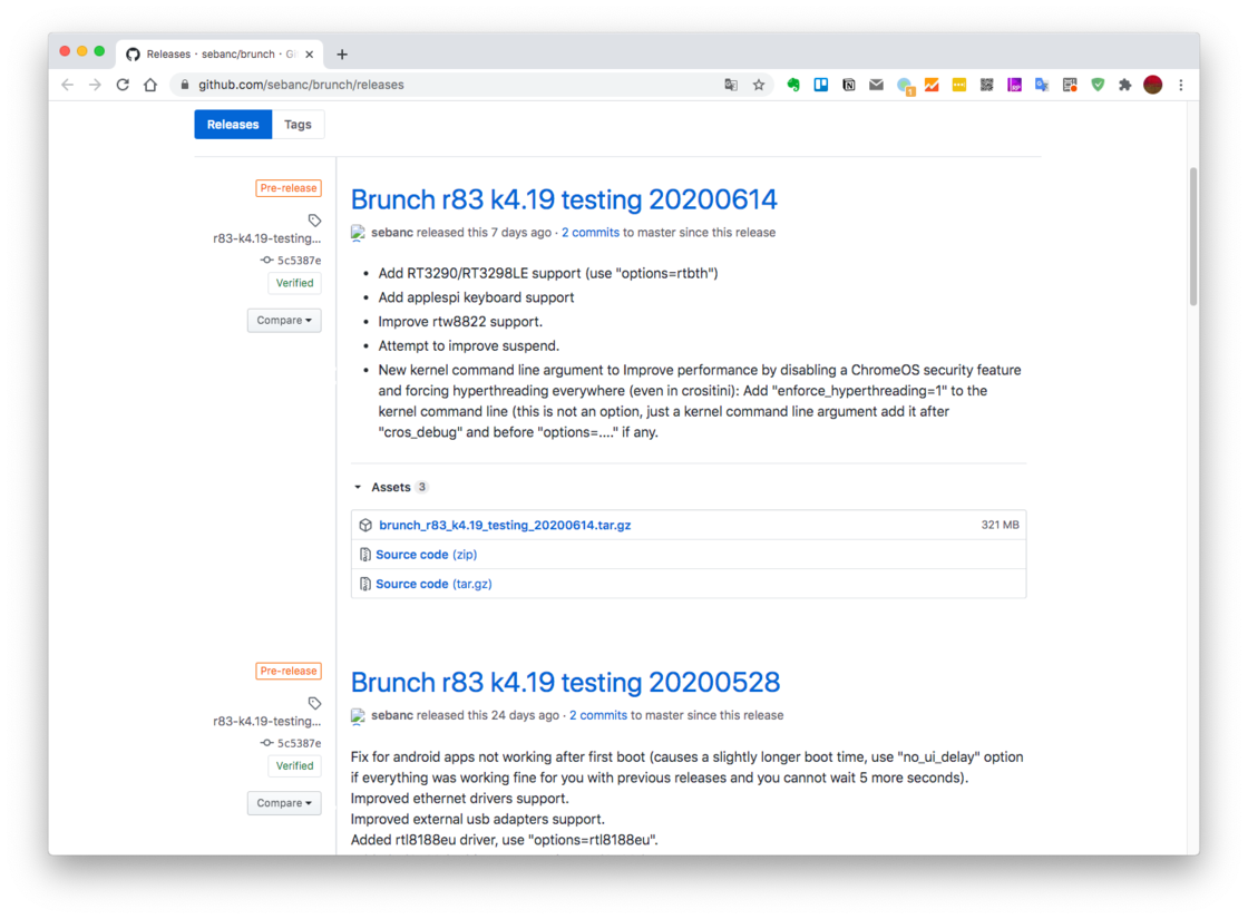 緊接著我們需要下載 Chrome 安裝框架,開發(fā)人員 sebanc 開發(fā)的 Brunch 構(gòu)建框架,這里我們直接在其 GitHub 中下載,因?yàn)槲覀儼惭b的是最新版的 Chrome OS,因此選擇最新預(yù)發(fā)行版本「Brunch r83 k4.19 testing 20200614」進(jìn)行下載。