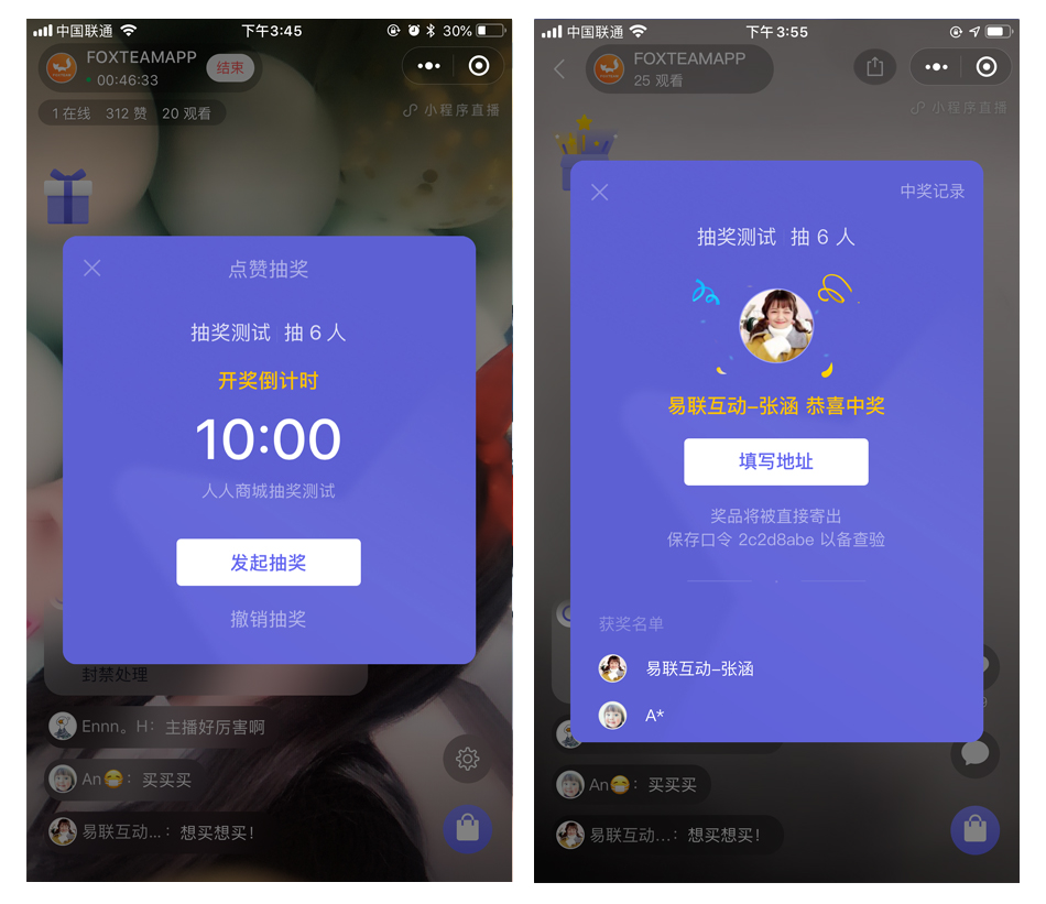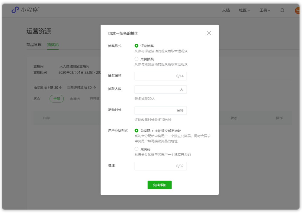 營銷功能-抽獎:后臺可設(shè)置評論抽獎和點贊抽獎兩種方式,主播點擊抽獎過程中,評論或點贊的用戶可以參與抽獎,中獎用戶憑借獲得的唯一兌獎碼進(jìn)行獎品兌換。商家可在后臺獲取用戶信息,操作便捷體驗流暢。