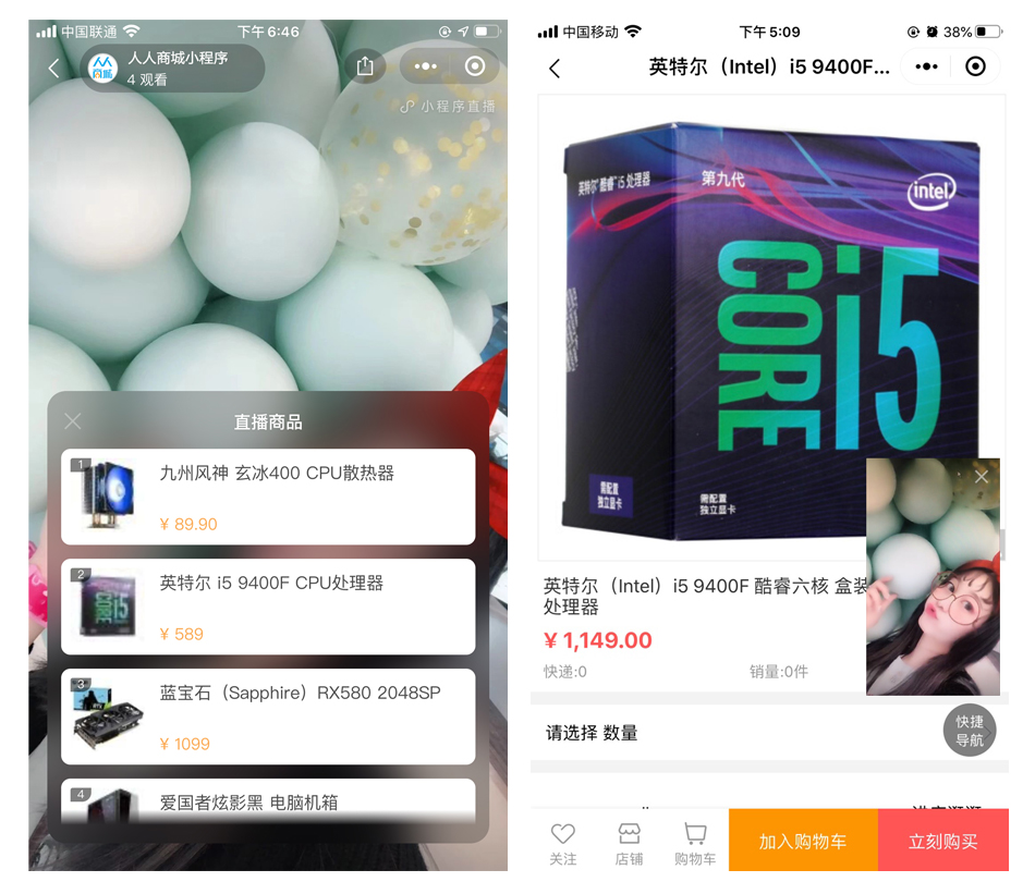 商品購買:直播頁面提供購物車按鈕,觀眾點擊可直接進(jìn)入商品詳情頁,完成小程序直接購買。通過直播轉(zhuǎn)至詳情頁時,直播仍將以浮窗形式出現(xiàn),便于用戶隨時返回直播間。