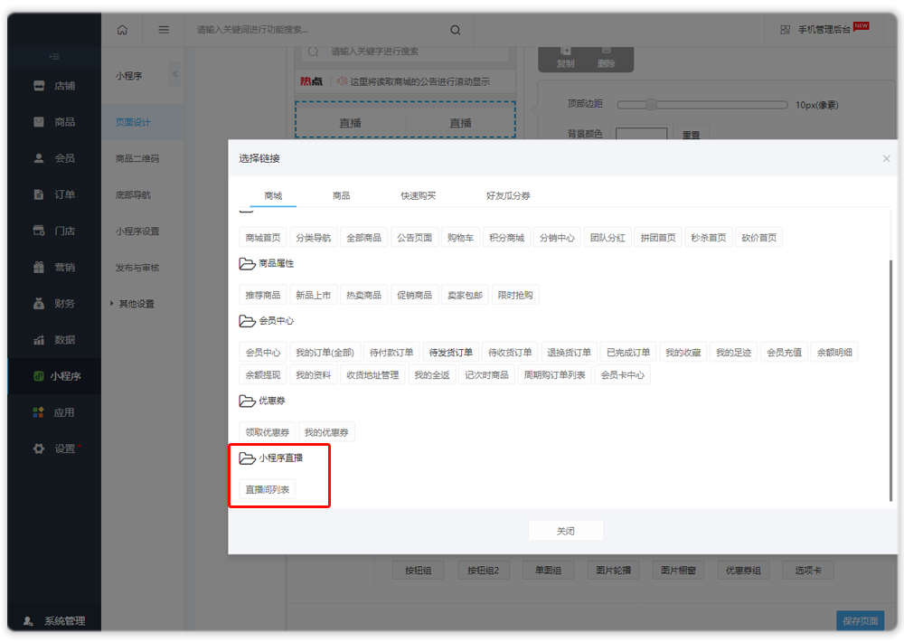 人人商城管理后臺負(fù)責(zé)同步微信直播間及自定義裝修小程序直播間入口。